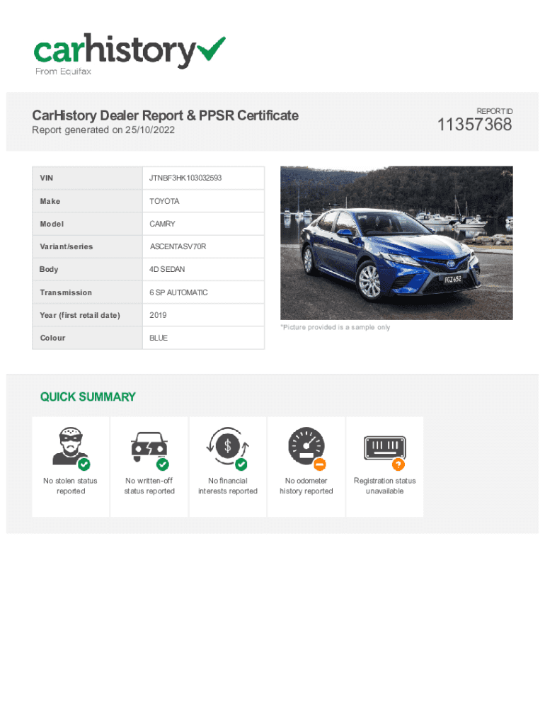 REPORT IDCarHistory Dealer Report & PPR Certificate11357368Report generated on 25/10/2022VINJTNBF3HK103032593MakeTOYOTAModelCAMRYVariant/seriesASCENTASV70RBody4D SEDANTransmission6 SP Automaticities