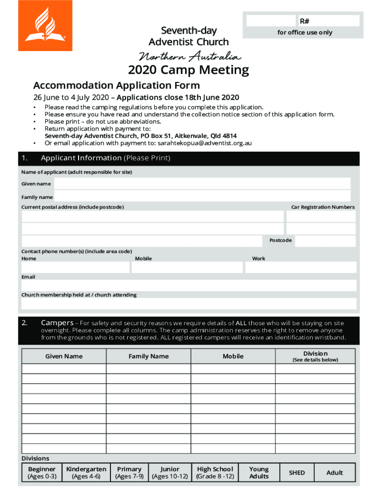 R# for office use only2020 Camp Meeting Accommodation Application Form 26 June to 4 July 2020 Applications close 18th June 2020 1. Please read the camping regulations before you complete this application.