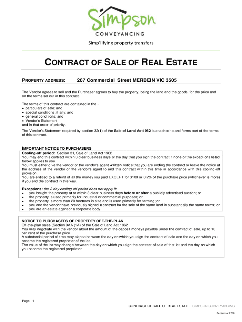 Simplifying property transfersCONTRACT OF SALE OF REAL ESTATE PROPERTY ADDRESS:207 Commercial Street MERLIN VIC 3505The Vendor agrees to sell and the Purchaser agrees to buy the property, being the