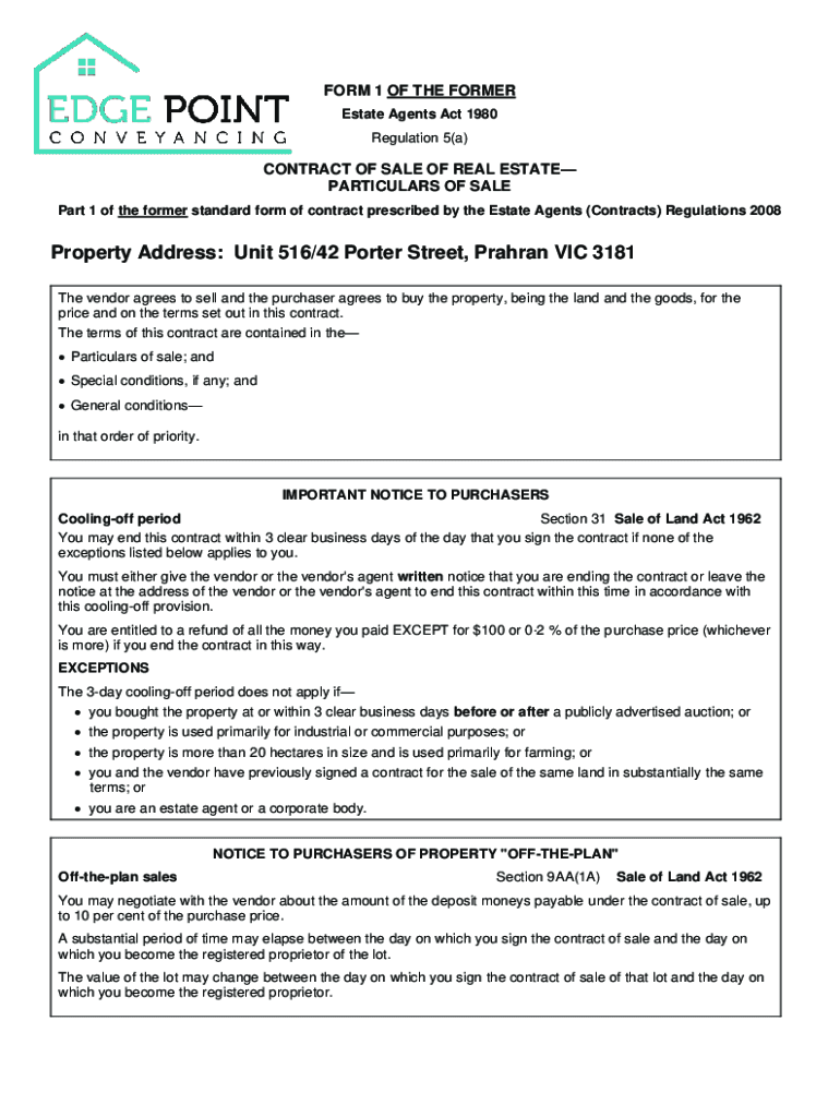 FORM 1 OF THE FORMER Estate Agents Act 1980 Regulation 5(a)CONTRACT OF SALE OF REAL ESTATE PARTICULARS OF SALE Part 1 of the former standard form of contract prescribed by the Estate Agents (Contracts)