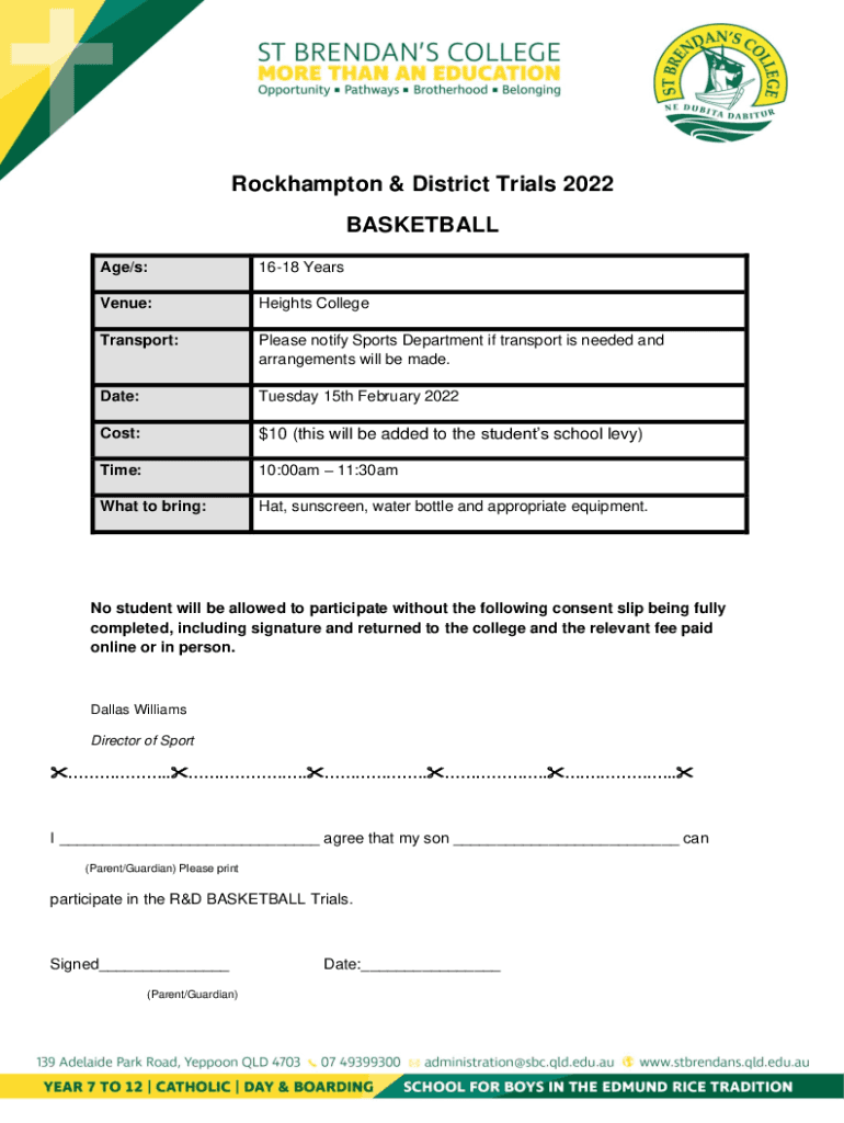 Rockhampton & District Trials 2022 BASKETBALL Age/s:1618 Revenue:Heights CollegeTransport:Please notify Sports Department if transport is needed and arrangements will be made. Date:Tuesday 15th February