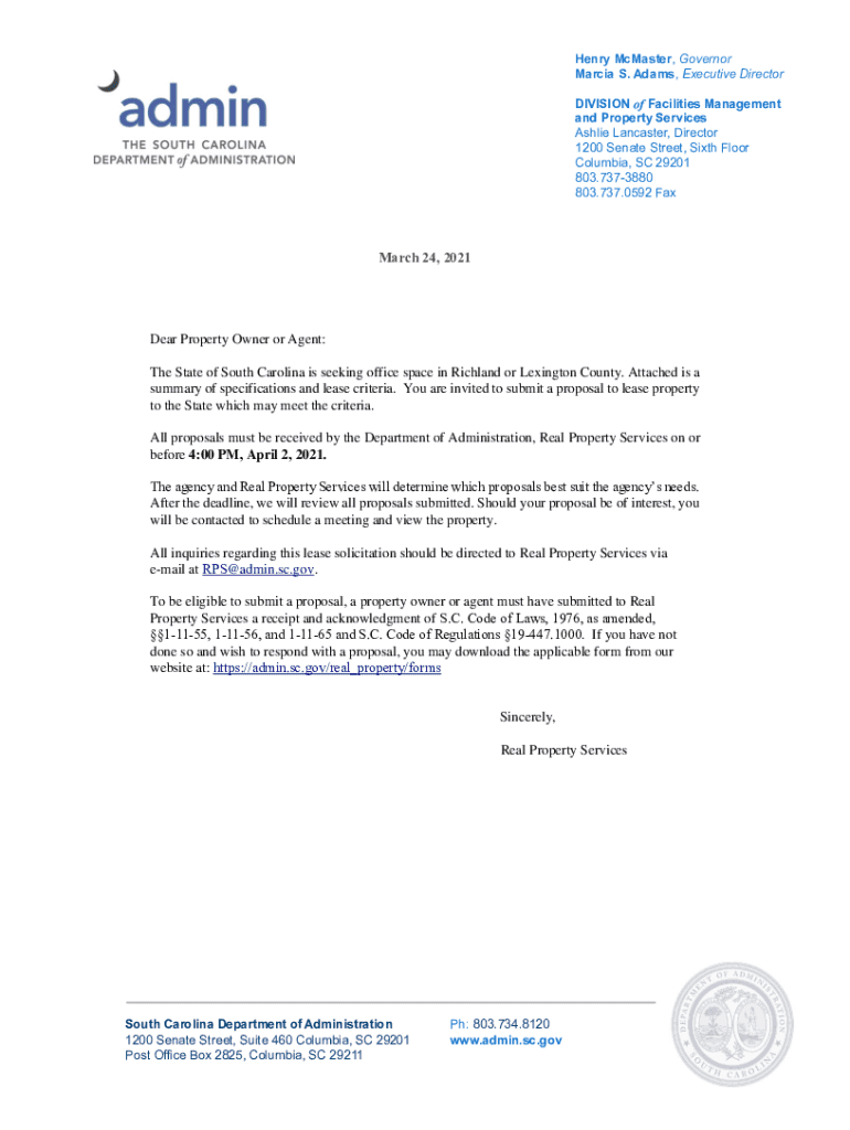 Henry McMaster, Governor Marcia S. Adams, Executive Director DIVISION of Facilities Management and Property Services Ashlee Lancaster, Director 1200 Senate Street, Sixth Floor Columbia, SC 29201 803.7373880