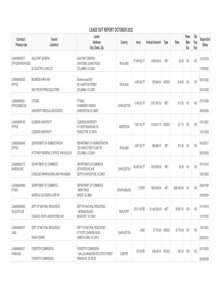 LEASE OUT REPORT OCTOBER 2022 Contract / Primary Lieutenant LandlordLesee Address City, State, ZipCountyLOA0006000071 ADJUTANT GENERAL OFFICE/WAREHOUSE SC ELECTRIC & GAS ADJUTANT GENERAL 5 NATIONAL