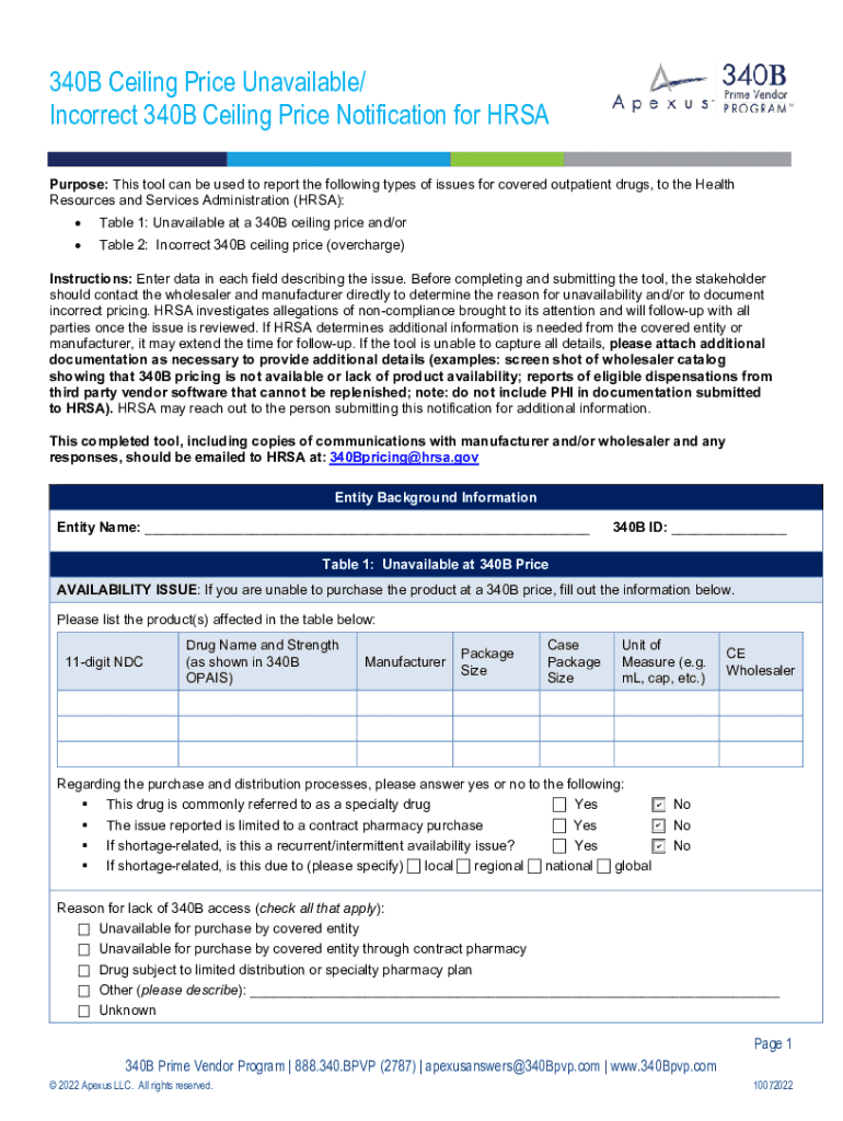 340B Ceiling Price Unavailable/ Incorrect 340B Ceiling Price Notification for RSA Purpose: This tool can be used to report the following types of issues for covered outpatient drugs, to the Health