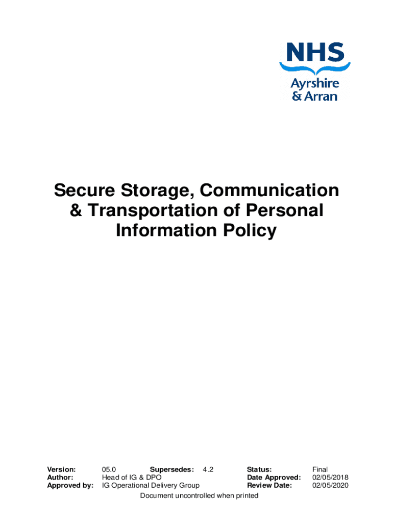 Secure Storage, Communication & Transportation of Personal Information PolicyVersion: Author: Approved by:Supersedes: 4.2 05.0 Head of IG & DPO IG Operational Delivery GroupStatus: Date Approved: