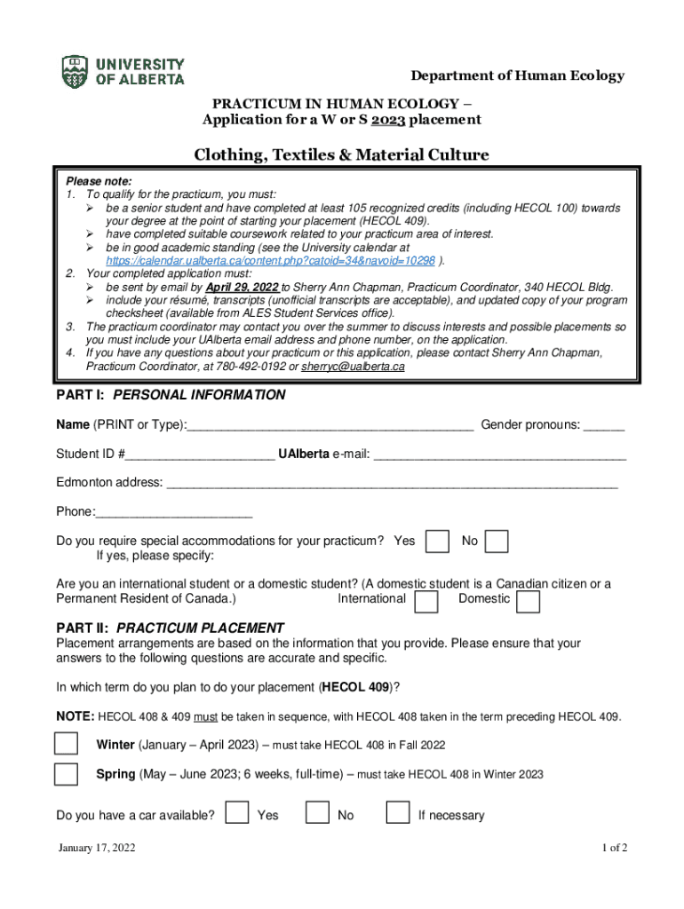 Department of Human Ecology PRACTICUM IN HUMAN ECOLOGY Application for a W or S 2023 placementClothing, Textiles & Material Culture Please note: 1. To qualify for the practicum, you must: be a senior