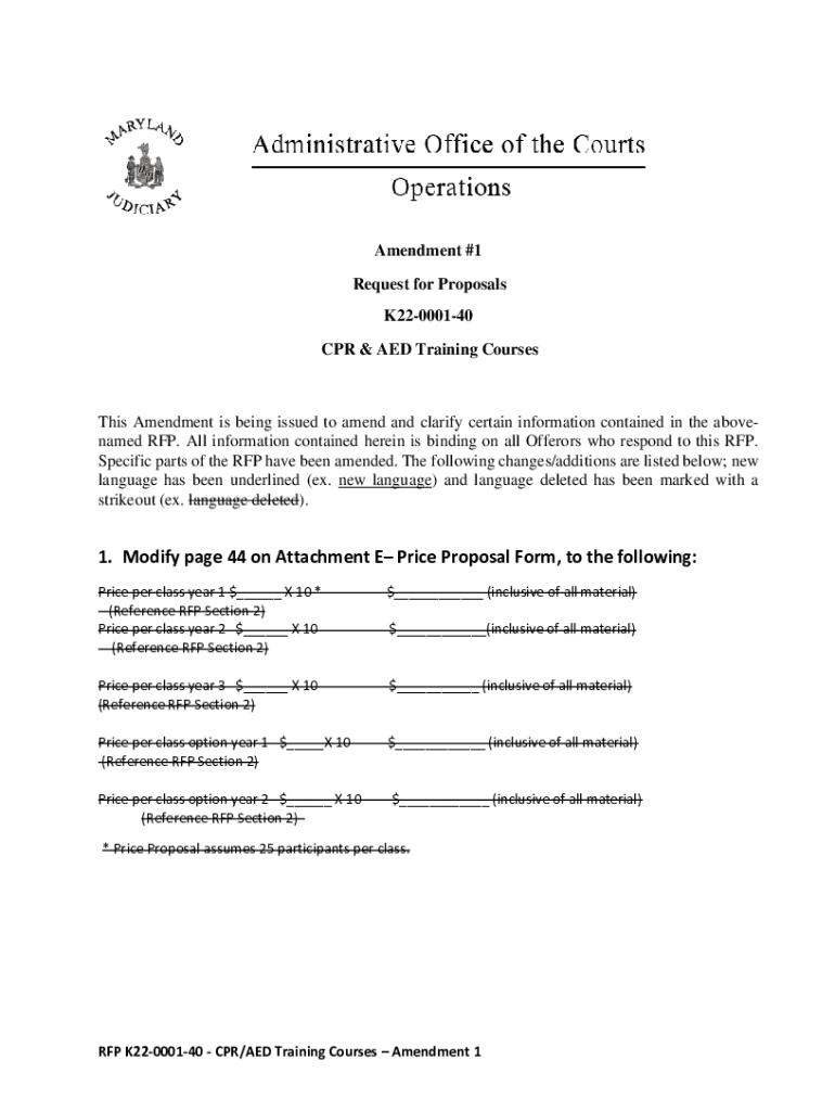 Amendment #1 Request for Proposals K22000140 CPR & AED Training CoursesThis Amendment is being issued to amend and clarify certain information contained in the above named RFP. All information contained
