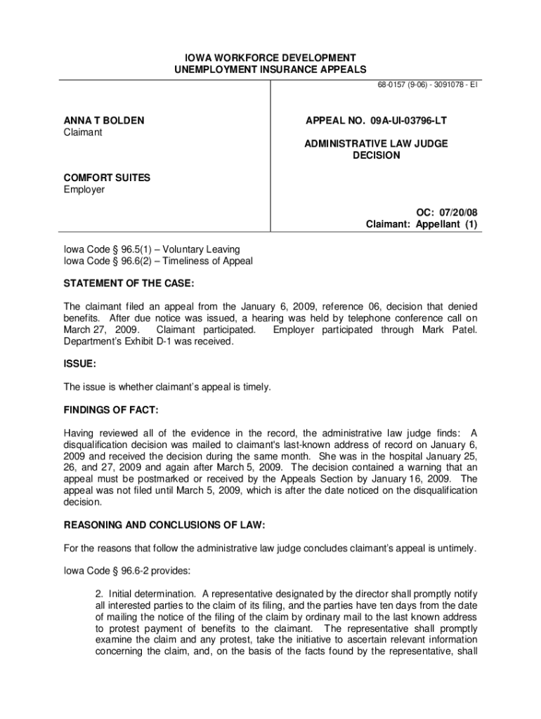 IOWA WORKFORCE DEVELOPMENT UNEMPLOYMENT INSURANCE APPEALS 680157 (906) 3091078 DIANNA TB OLDEN ClaimantAPPEAL NO. 09AUI03796LT ADMINISTRATIVE LAW JUDGE DECISIONCOMFORT SUITES Employer OC: 07/20/08