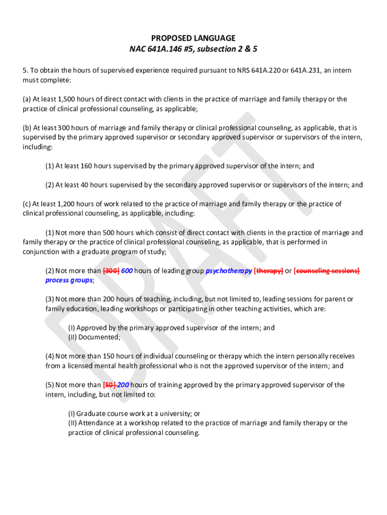 PROPOSED LANGUAGE NAC 641A.146 #5, subsection 2 & 5 5. To obtain the hours of supervised experience required pursuant to NRS 641A.220 or 641A.231, an intern must complete: (a) At least 1,500 hours