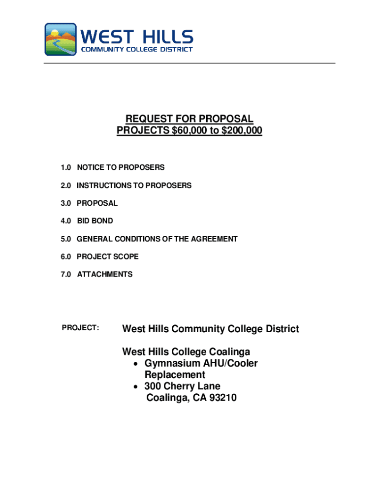 REQUEST FOR PROPOSAL PROJECTS $60,000 to $200,0001.0 NOTICE TO PROPOSERS 2.0 INSTRUCTIONS TO PROPOSERS 3.0 PROPOSAL 4.0 BID BOND 5.0 GENERAL CONDITIONS OF THE AGREEMENT 6.0 PROJECT SCOPE 7.0 ATTACHMENTSPROJECT:West