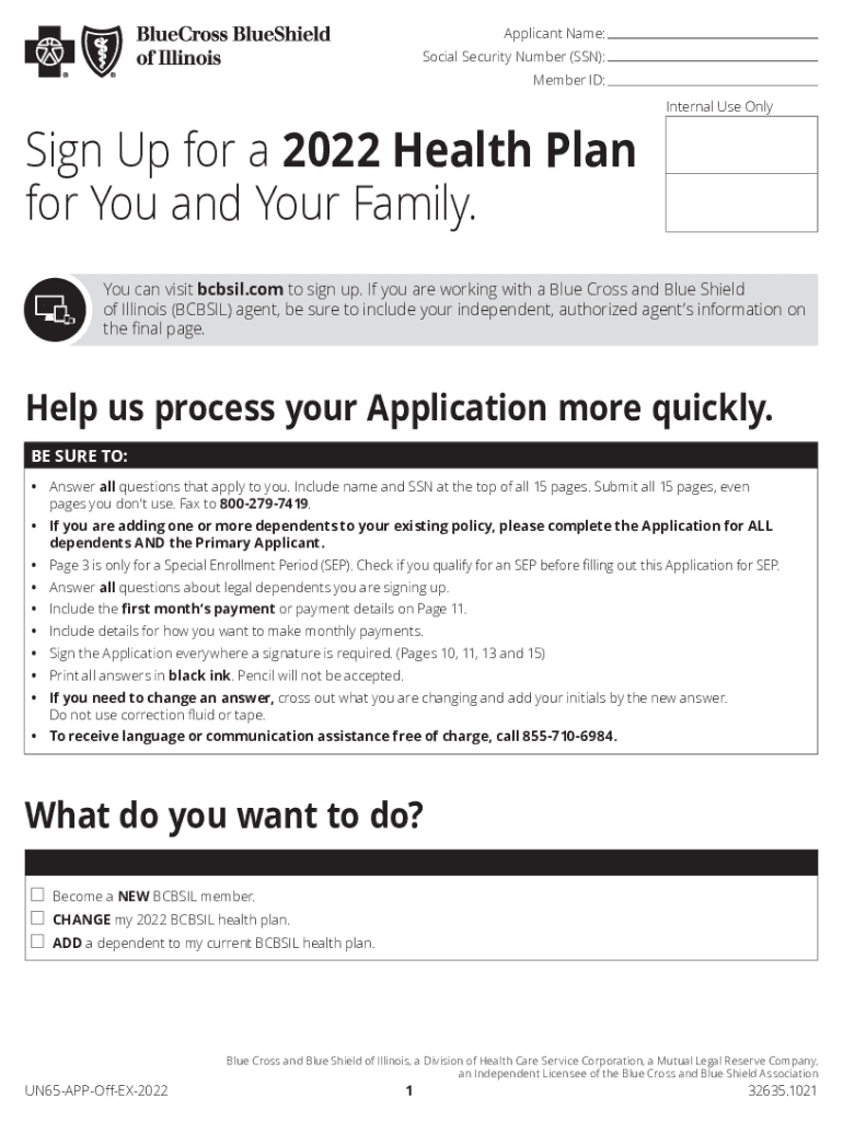 Applicant Name: Social Security Number (SSN): Member ID:Sign Up for a 2022 Health Plan for You and Your Family. Internal Use Only can visit bcbsil.com to sign up. If you are working with a Blue Cross