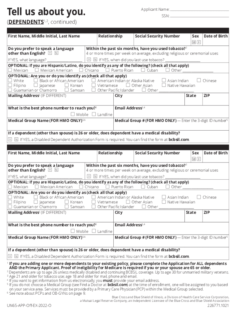 Tell us about you. Applicant Name: SSN:(DEPENDENTS, continued) 1,2First Name, Middle Initial, Last NameRelationshipSocial Security NumberSexDate of Birthmark you prefer to speak a language other than