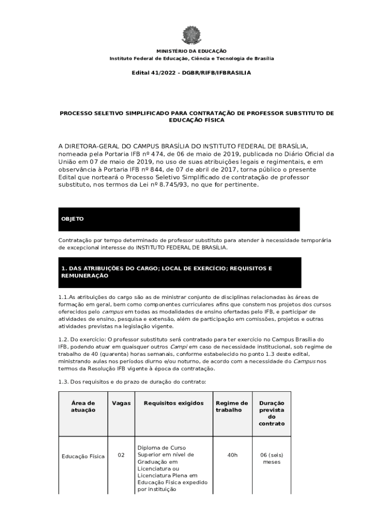 MINISTRY DA EDUC AO Institute Federal de Educao, India e Technology de BrasliaEdital 41/2022 DBR/RIFF/IFBRASILIAPROCESSO SELECTIVE SIMPLIFIED PARA CONTRA TAO DE PROFESSOR SUBSTITUTE DE EDUC AO FSI