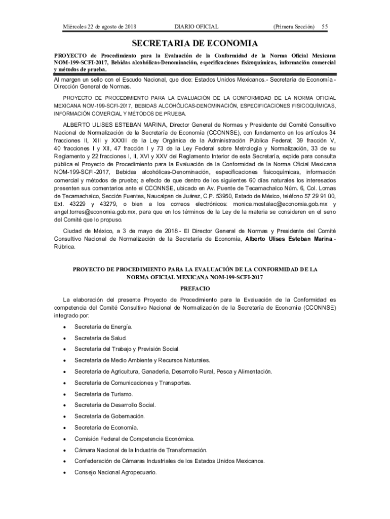 Circles 22 de Acosta de 2018DIARIO OFFICIAL(Primer Section)55SECRETARIA DE ECONOMIC PROJECT de Procedimiento para la Evaluation DE la Conforming DE la Norma Official Mexican NOM199SCFI2017, Besides