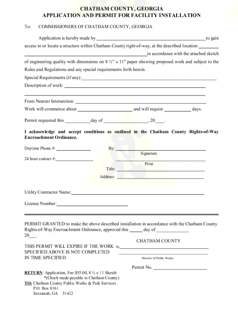 CHATHAM COUNTY, GEORGIA APPLICATION AND PERMIT FOR FACILITY INSTALLATION To:COMMISSIONERS OF CHATHAM COUNTY, GEORGIA Application is hereby made byte gain access to or locate a structure within Chatham