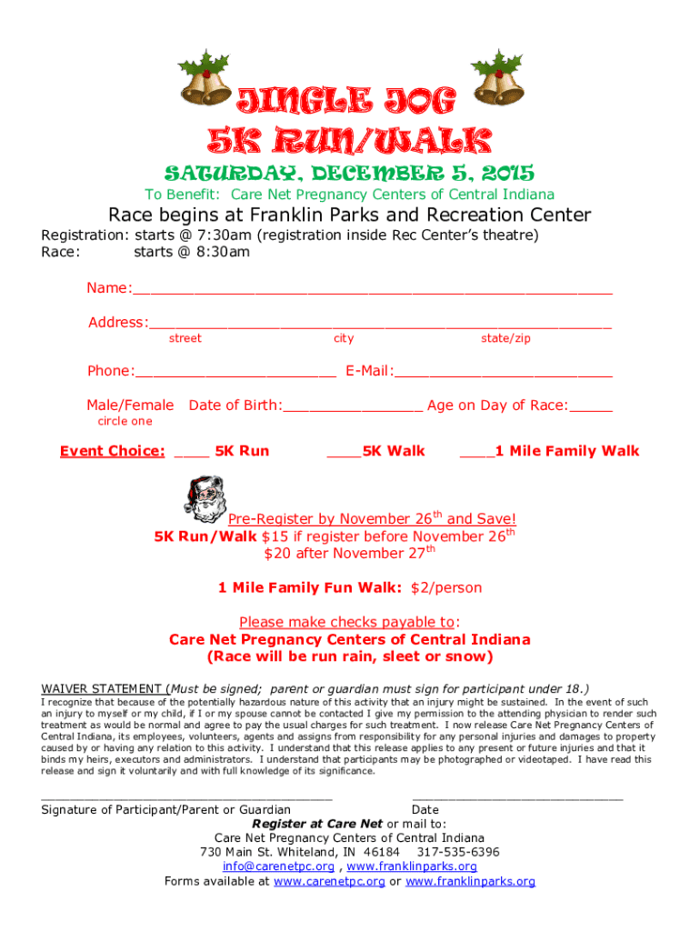 JINGLE JOG 5K RUN/WALK SATURDAY, DECEMBER 5, 2015, To Benefit: Care Net Pregnancy Centers of Central IndianaRace begins at Franklin Parks and Recreation CenterRegistration: starts @ 7:30am (registration