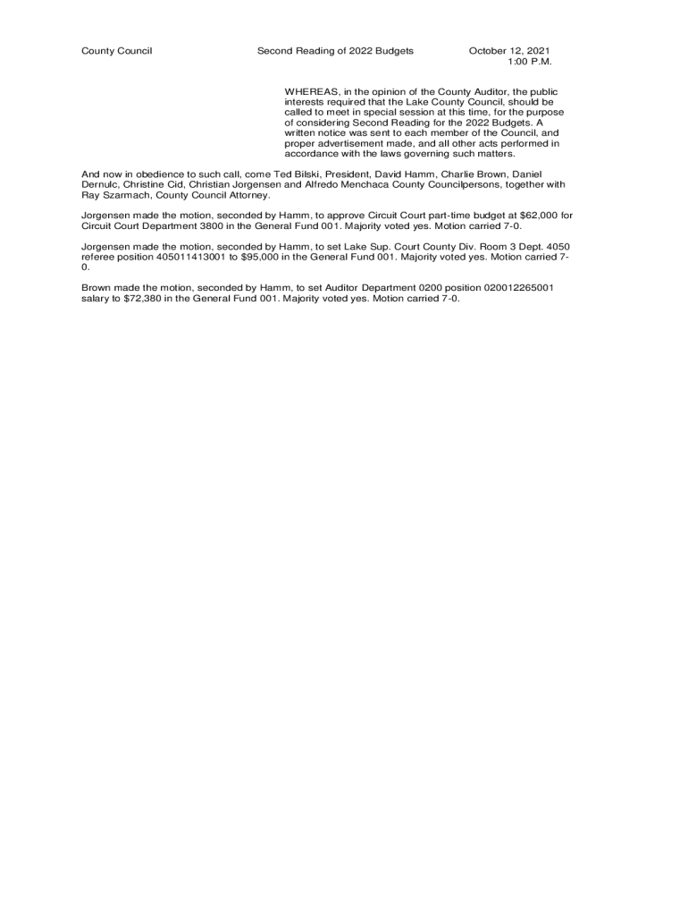 County CouncilSecond Reading of 2022 Budgets October 12, 2021 1:00 P.M.WHEREAS, in the opinion of the County Auditor, the public interests required that the Lake County Council, should be called to