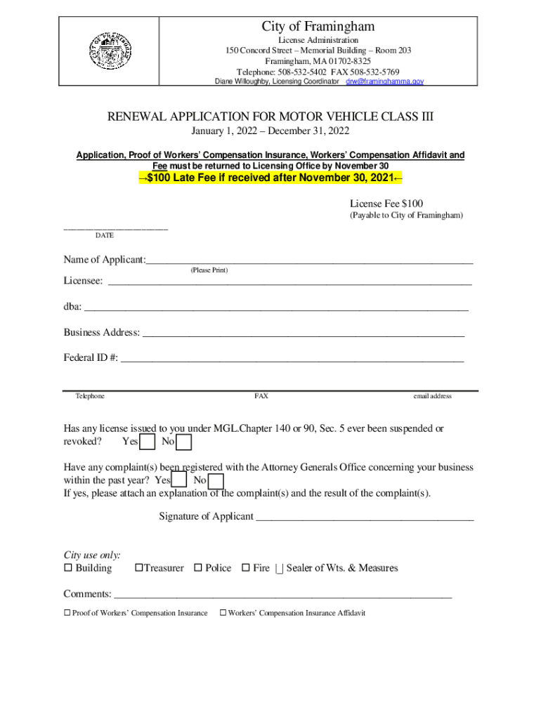 City of Framingham License Administration 150 Concord Street Memorial Building Room 203 Framingham, MA 017028325 Telephone: 5085325402 FAX 5085325769 Diane Willougbhy, Licensing Coordinator drw@framinghamma.govRENEWAL