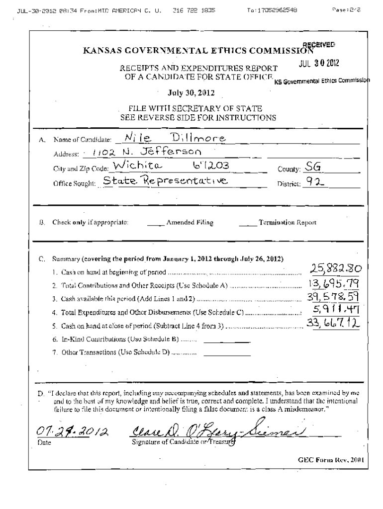 JUL302012 08: 34 From: t1ID AMERICAN C. U. To: 17852962548316 722 1835KANSAS GOVERNMENTAL ETHICSCOMMISSI8CE&VED JUL302012RECETPTS AND EXPENDITURES REPORT OF A CANDIDATE FOR STATE OFFICE KSGovemmental