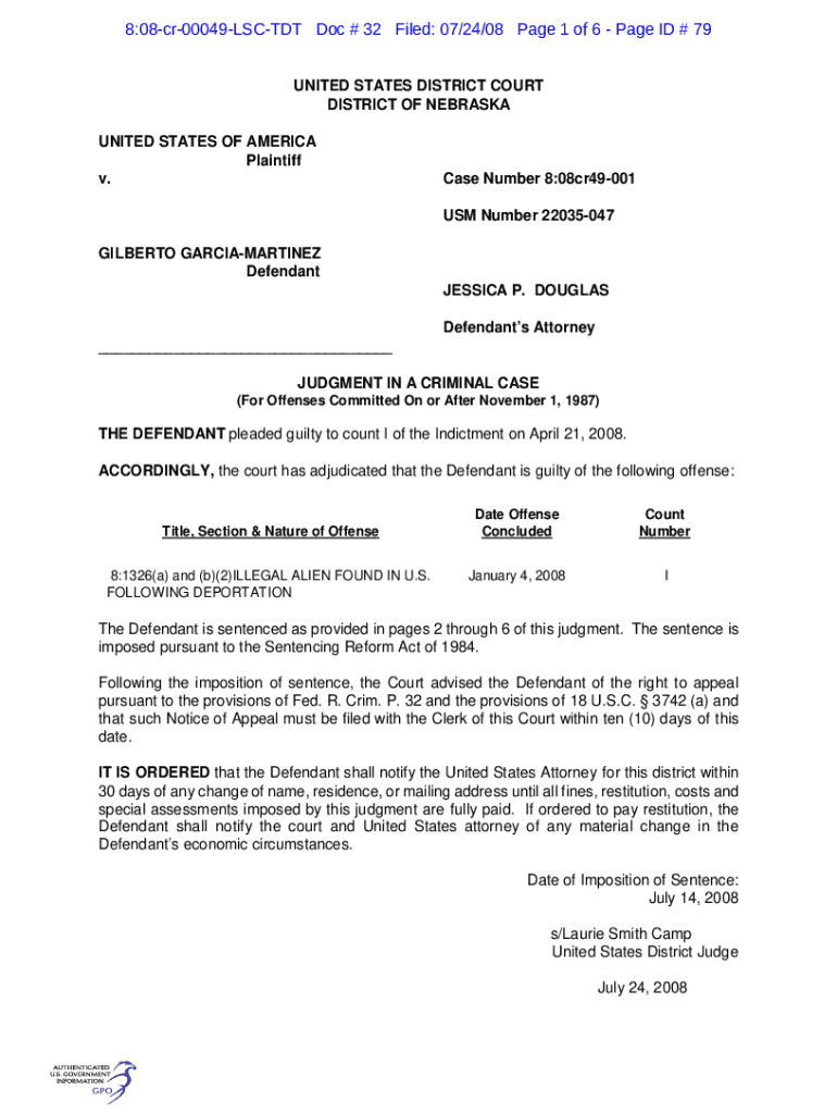 8:08cr00049LSCTDT Doc # 32 Filed: 07/24/08-Page 1 of 6-Page ID # 79 UNITED STATES DISTRICT COURT DISTRICT OF NEBRASKA UNITED STATES OF AMERICA Plaintiff v. Case Number 8:08cr49001 US Number 22035047GILBERTO