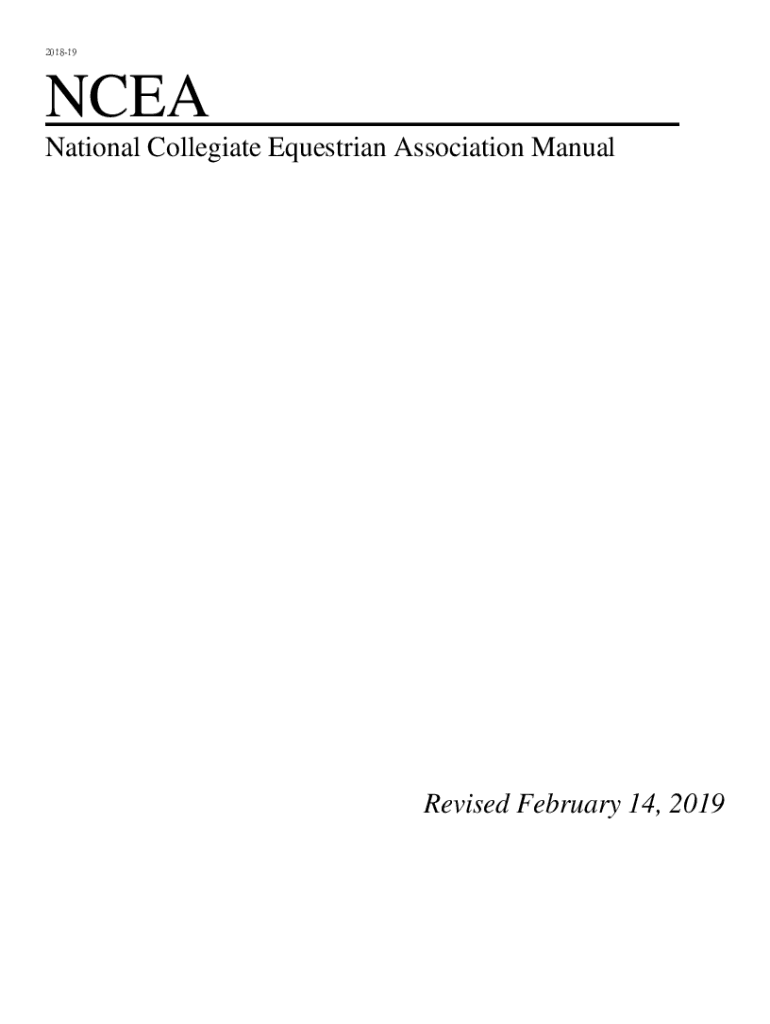 201819NCEA National Collegiate Equestrian Association ManualRevised February 14, 2019TABLE OF CONTENTS Article 1 Name, Mission Statement 1.1 NAME... 1 1.2 MISSION STATEMENT... 1Article 2 Organization