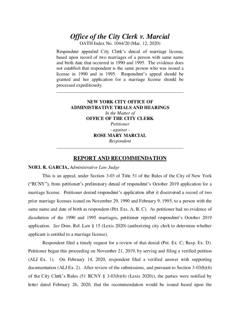 Office of the City Clerk v. Martial OATH Index No. 1044/20 (Mar. 12, 2020) Respondent appealed City Clerks denial of marriage license, based upon record of two marriages of a person with same name