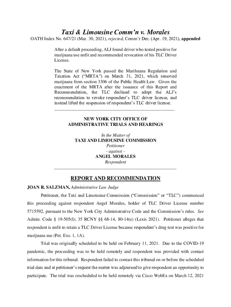 Taxi & Limousine Common v. Morales OATH Index No. 647/21 (Mar. 30, 2021), rejected, Comma Dec. (Apr. 19, 2021), appended After a default proceeding, ALJ found driver who tested positive for marijuana