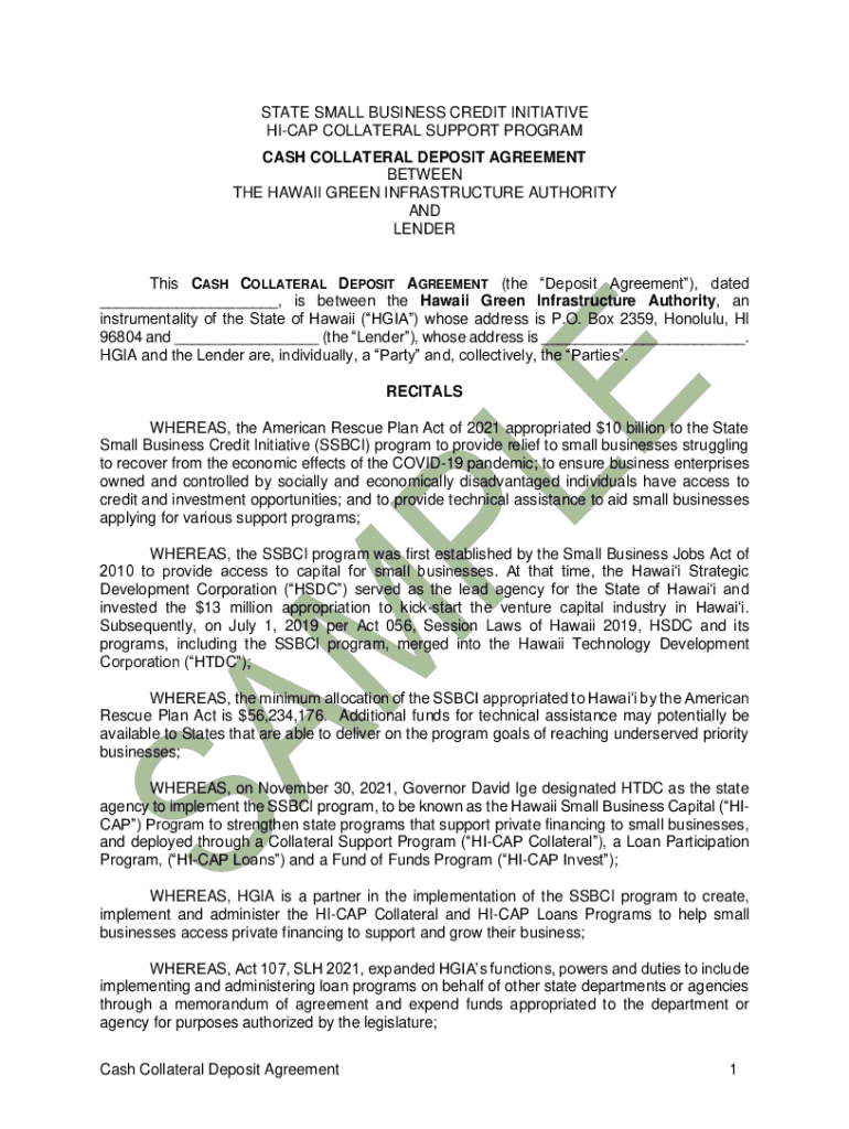 STATE SMALL BUSINESS CREDIT INITIATIVE HCAP COLLATERAL SUPPORT PROGRAM CASH COLLATERAL DEPOSIT AGREEMENT BETWEEN THE HAWAII GREEN INFRASTRUCTURE AUTHORITY AND LENDER This CASH COLLATERAL DEPOSIT AGREEMENT