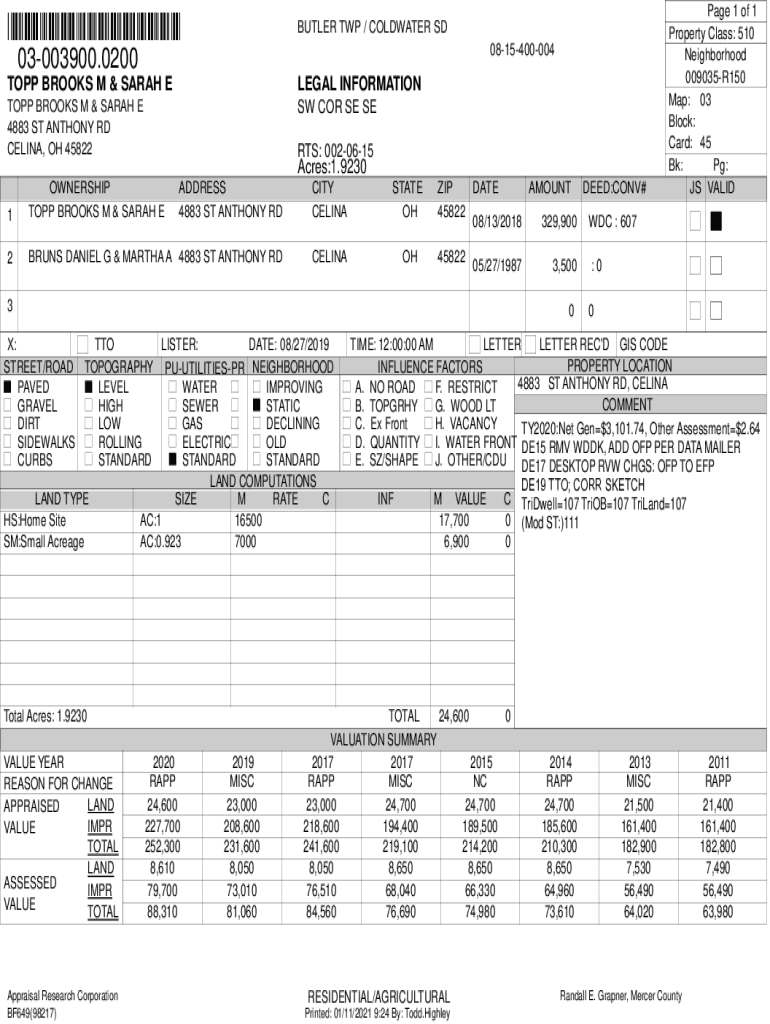 *030039000200×BUTLER TWP / GOLDWATER STOP BROOKS M & SARAH LEGAL INFORMATIONTOPP BROOKS M & SARAH E 4883 ST ANTHONY RD CELINA, OH 45822SW COR SE SE081540000403003900.0200RTS: 0020615Acres:1.9230