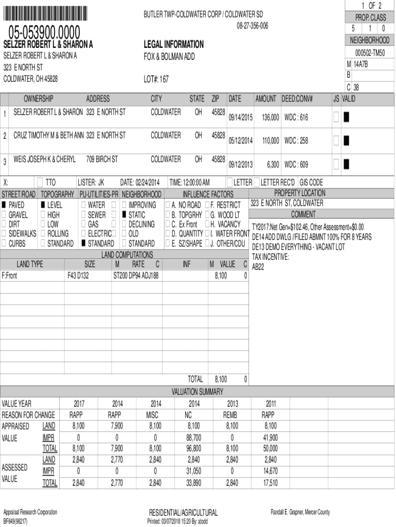 *050539000000× 05053900.0000 SELLER ROBERT L & SHARON BUTLER TWPCOLDWATER CORP / GOLDWATER SD 0827356006LEGAL INFORMATIONSELZER ROBERT L & SHARON A 323 E NORTH ST GOLDWATER, OH 45828FOX & BOWMAN
