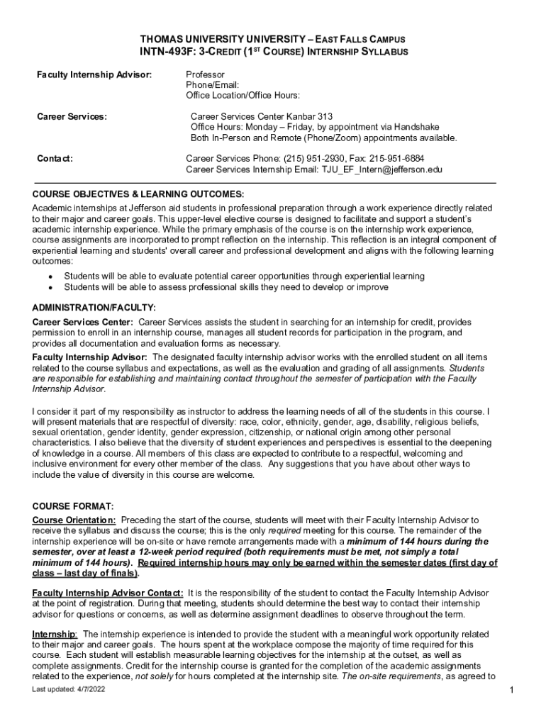 THOMAS UNIVERSITY EAST FALLS CAMPUSINTN493F: 3CREDIT (1ST COURSE) INTERNSHIP SYLLABUS Faculty Internship Advisor:Career Services:Contact:Professor Phone/Email: Office Location/Office Hours: Career