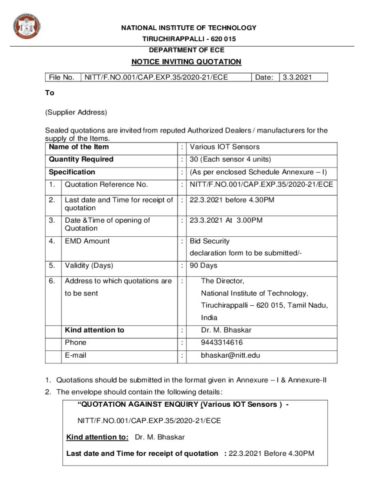 NATIONAL INSTITUTE OF TECHNOLOGY TIRUCHIRAPPALLI 620 015 DEPARTMENT OF ECONOMIC INVITING QUOTATION File No.NITT/F.NO.001/CAP.EXP.35/202021/ECEDate:3.3.2021To (Supplier Address) Sealed quotations are