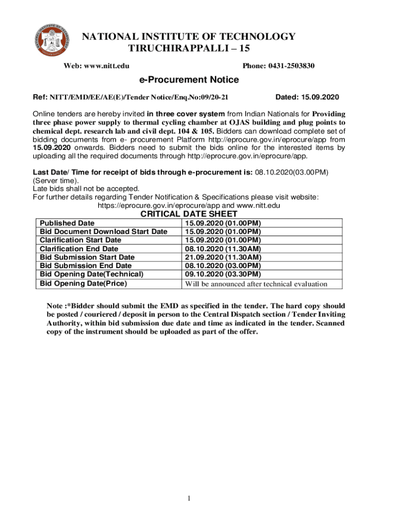 NATIONAL INSTITUTE OF TECHNOLOGY TIRUCHIRAPPALLI 15 Web: www.nitt.eduPhone: 04312503830eProcurement Notice Ref: PITT/EMD/EE/AE(E)/Tender Notice/End. No:09/2021Dated: 15.09.2020Online tenders are hereby