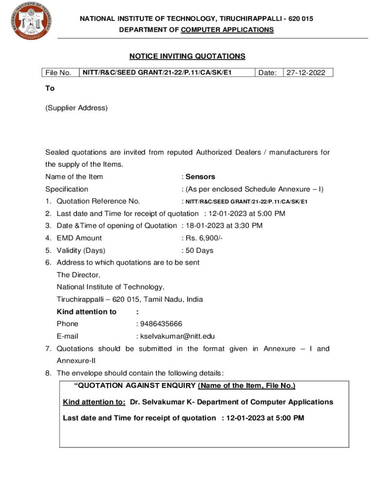 NATIONAL INSTITUTE OF TECHNOLOGY, TIRUCHIRAPPALLI 620 015 DEPARTMENT OF COMPUTER APPLICATIONSNOTICE INVITING QUOTATIONS PITT/R&C/SEED GRANT/2122/P.11/CA/SK/E1File No. Date:27122022To (Supplier Address)Sealed