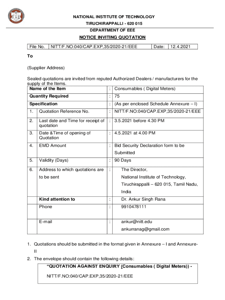NATIONAL INSTITUTE OF TECHNOLOGY TIRUCHIRAPPALLI 620 015 DEPARTMENT OF NOTICE INVITING QUOTATION File No.NITT/F.NO:040/CAP.EXP,35/202021/EEEDate:12.4.2021To (Supplier Address) Sealed quotations are