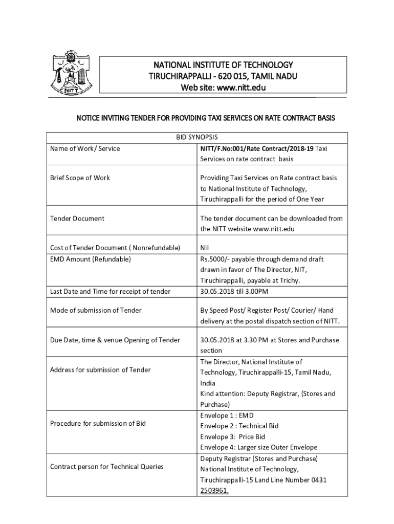NATIONAL INSTITUTE OF TECHNOLOGY TIRUCHIRAPPALLI 620 015, TAMIL NADU Website: www.nitt.edu NOTICE INVITING TENDER FOR PROVIDING TAXI SERVICES ON RATE CONTRACT Badinage of Work/ Service BID SYNOPSIS