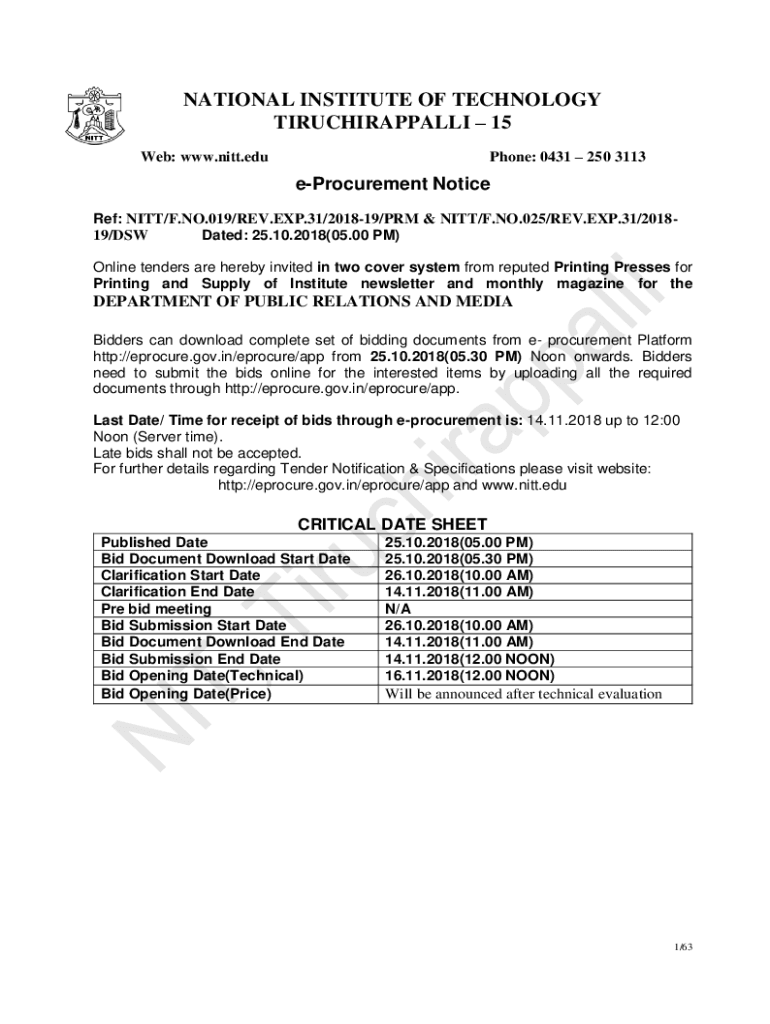 NATIONAL INSTITUTE OF TECHNOLOGY TIRUCHIRAPPALLI 15 Phone: 0431 250 3113Web: www.nitt.edueProcurement Notice Ref: PITT/F.NO.019/REV.EXP.31/201819/PRM & PITT/F.NO.025/REV.EXP.31/201819/DSW Dated: 25.10.2018(05.00