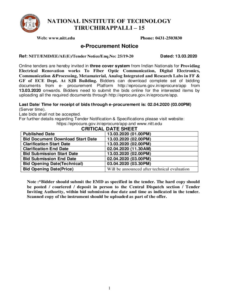 NATIONAL INSTITUTE OF TECHNOLOGY TIRUCHIRAPPALLI 15 Web: www.nitt.eduPhone: 04312503830eProcurement Notice Ref: PITT/EMD/EE/AE(E)/Tender Notice/End. No: 25/1920Dated: 13.03.2020Online tenders are
