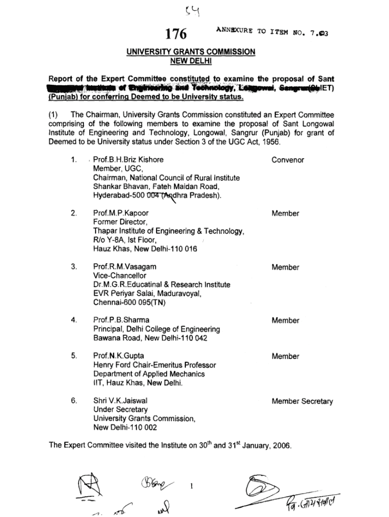 176ANNJSXURE TO IBM NO* 7 *3UNIVERSITY GRANTS COMMISSION NEW DELHI Report of the Expert Committee constituted to examine the proposal of Sent (Punjab) for conferring Deemed to be University status.