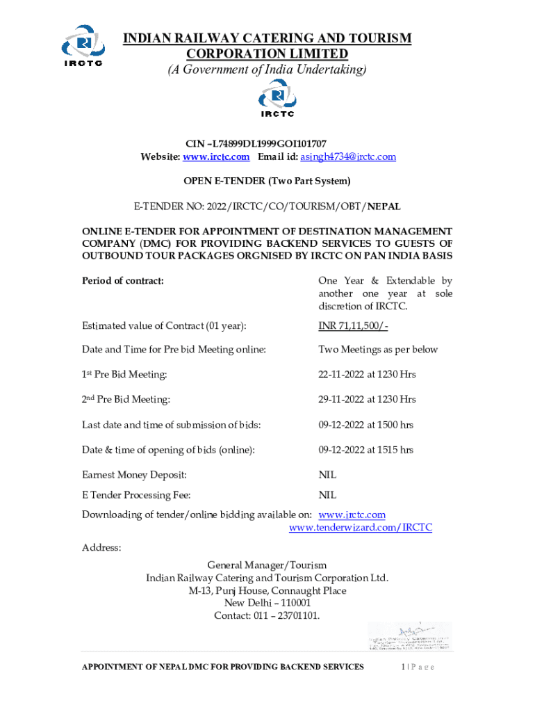 INDIAN RAILWAY CATERING AND TOURISM CORPORATION LIMITED (A Government of India Undertaking)IN L74899DL1999GOI101707 Website: www.irctc.com Email ID: asingh4734@irctc.com OPEN TENDER (Two Part System)