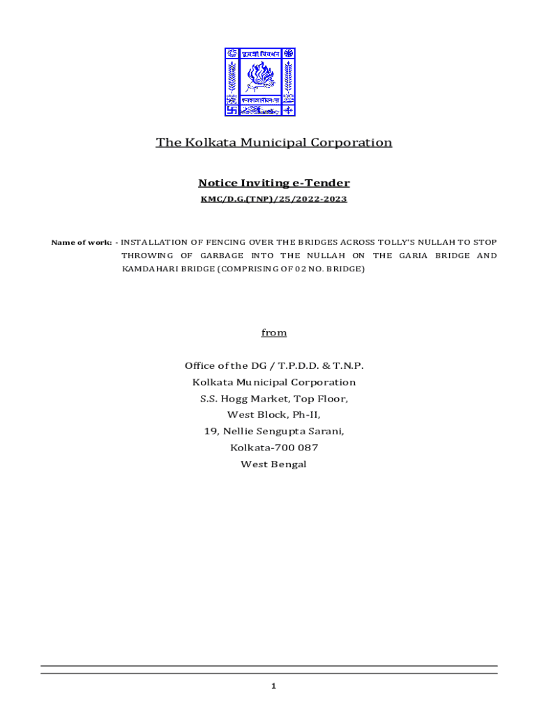 The Kolkata Municipal Corporation Notice Inviting tender KM/D.G.(TNP)/25/20222023Name of work: INSTALLATION OF FENCING OVER THE BRIDGES ACROSS TOLL\'S GULLAH TO STOPTHROWING OF GARBAGE INTO THE GULLAH