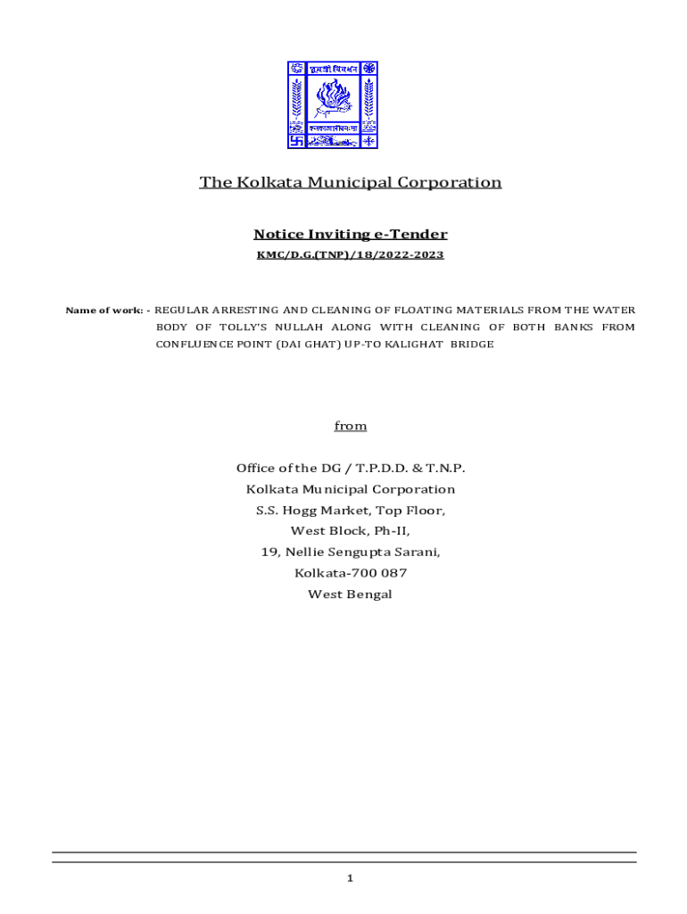 The Kolkata Municipal Corporation Notice Inviting tender KM/D.G.(TNP)/18/20222023Name of work: REGULAR ARRESTING AND CLEANING OF FLOATING MATERIALS FROM THE WATERBURY OF TOLL\'S GULLAH ALONG WITH