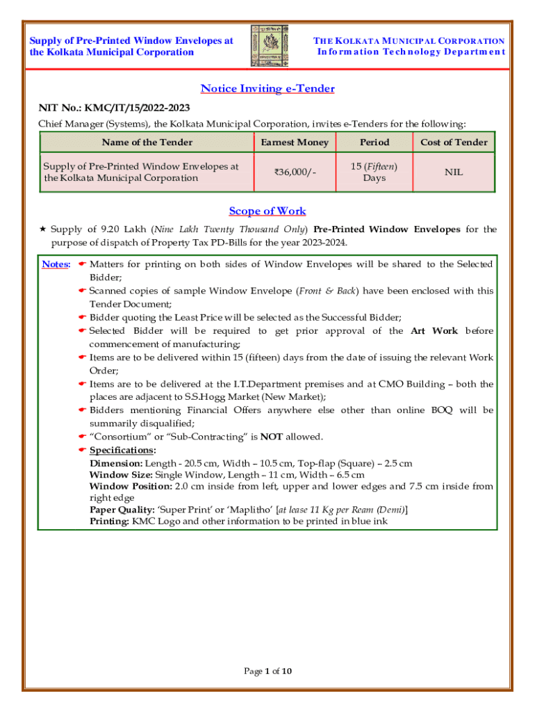 THE KOLKATA MUNICIPAL CORPORATION Information Technology DepartmentSupply of PrePrinted Window Envelopes at the Kolkata Municipal CorporationNotice Inviting tender NIT No.: KM/IT/15/20222023 Chief