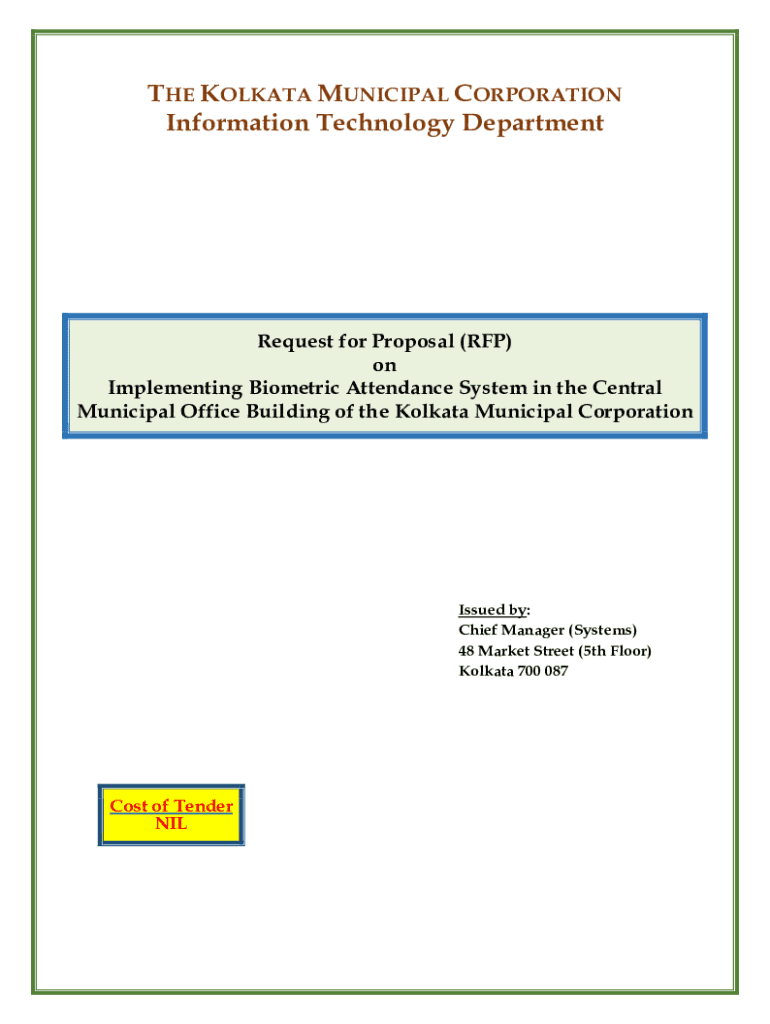 THE KOLKATA MUNICIPAL CORPORATION Information Technology DepartmentRequest for Proposal (RFP) on Implementing Biometric Attendance System in the Central Municipal Office Building of the Kolkata Municipal
