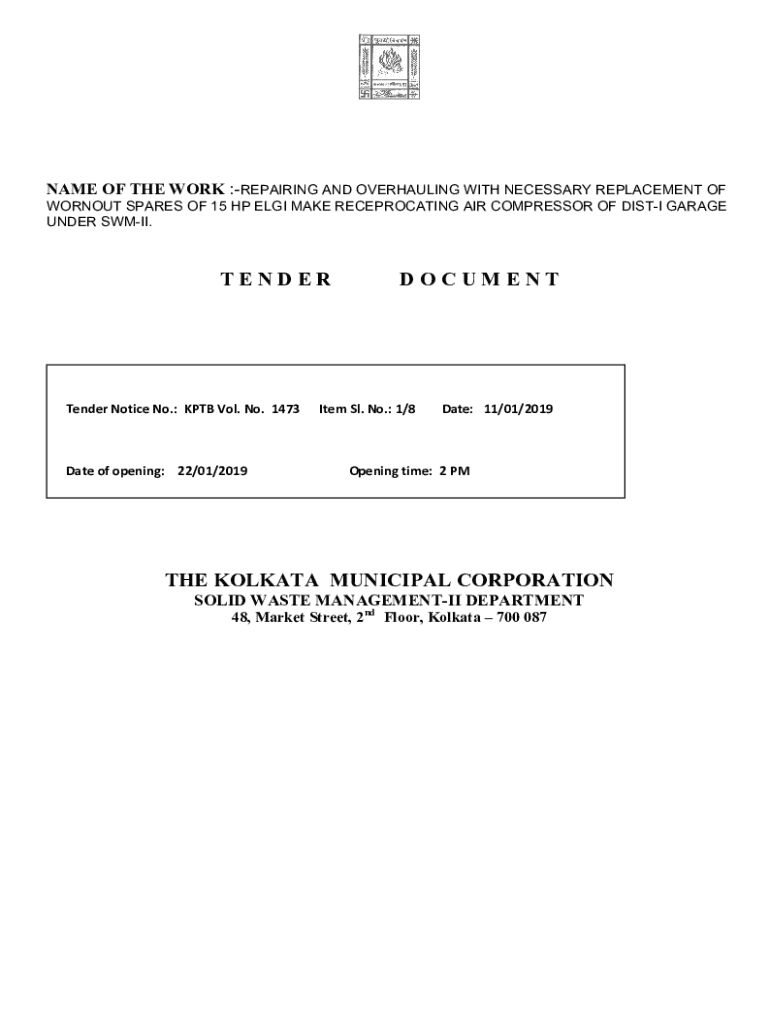 NAME OF THE WORK :REPAIRING AND OVERHAULING WITH NECESSARY REPLACEMENT OF WORKOUT SPARES OF 15 HP ELI MAKE RECIPROCATING AIR COMPRESSOR OF DIST GARAGE UNDER SEMI.TENDERTender Notice No.: PTB Vol.