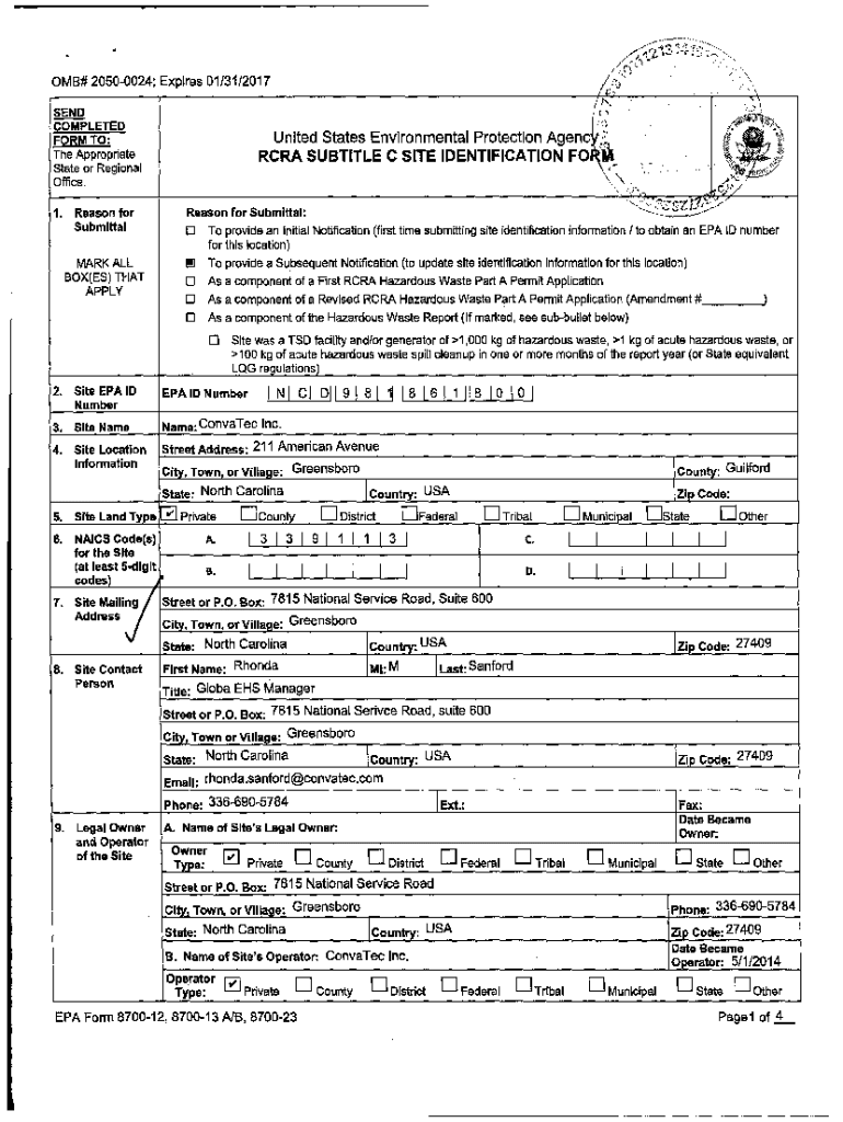 OMB# 20500024; Expires 01/31/2017\'\”\”! (:)SEND COMPLETED FORM TO: The Appropriate State or Regional Office. 1.1., ;., United States Environmental Protection Agency CRA SUBTITLE C SITE IDENTIFICATION