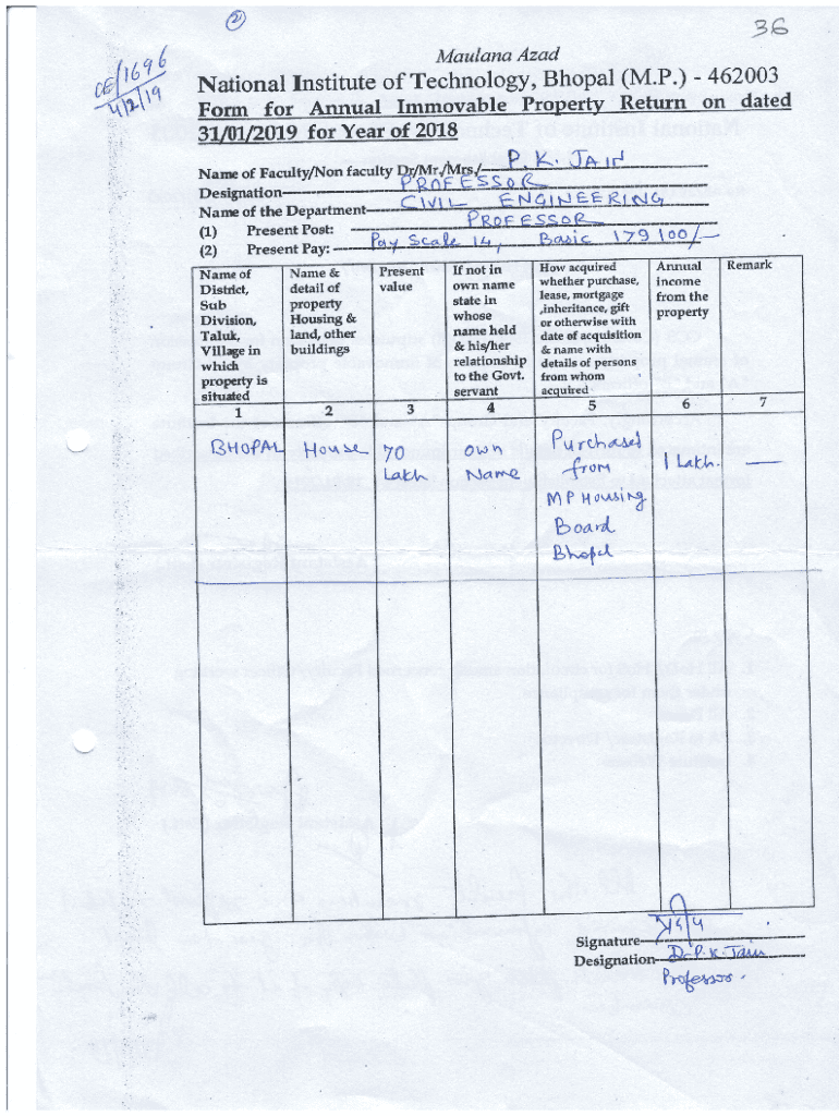 O(,49a Maulana AzadNational Institute of Technology, Bhopal (M.P.) 462003 Form for Annual Immovable Property Return on dated 31 \':1D019 for Year of\' 2018 Name of FacultYfirlon faculty Narc of the(1)