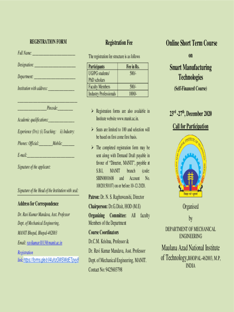 REGISTRATION FORM Full Name: ___ Designation: ___ Department: ___ Institution with address: ___ ___ ___Pin code:___ Academic qualifications:___ Experience (Yrs): (i) Teaching:ii) Industry:Phones: