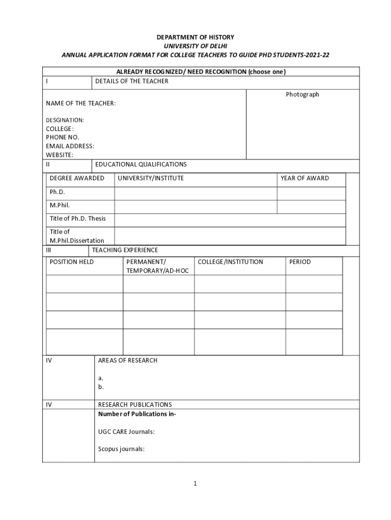 DEPARTMENT OF HISTORYUNIVERSITY OF SEMIANNUAL APPLICATION FORMAT FOR COLLEGE TEACHERS TO GUIDE PhD STUDENTS202122ALREADY RECOGNIZED/ NEED RECOGNITION (choose one)DETAILS OF THE TEACHERINAME OF THE