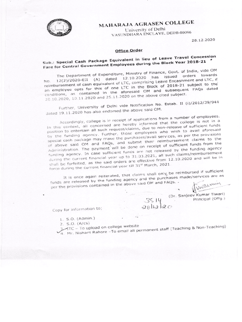 MAHARAJAH ARISEN COLLEGE (University of Delhi) Vasundhara Enclave, Delhi96 Application Form for Special Cash Package in lieu of LTC (LTC fare + EL encasement) during block year 2018211. Name/ Designation